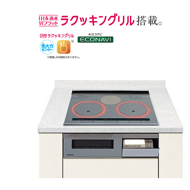 ■光火力センサー ■焼き物温度調節 ■焼き物アシスト(10メニュー) ■光/揚げ物温度調節 ■自動炊飯(後ろIH) ■こげつきお知らせ ■遠赤Wフラットラクッキングリル ■鍋を直接グリルに入れて調理 ■オーブン調理(80度?280度) ■自動調理(12メニュー) ■凍ったままIHグリル(8メニュー) ■天面操作部(ガラスタッチ式、フルドット液晶) ■本体操作部(プッシュ式、フルドット液晶) ■AIエコナビ ■レンジフード換気連動対応